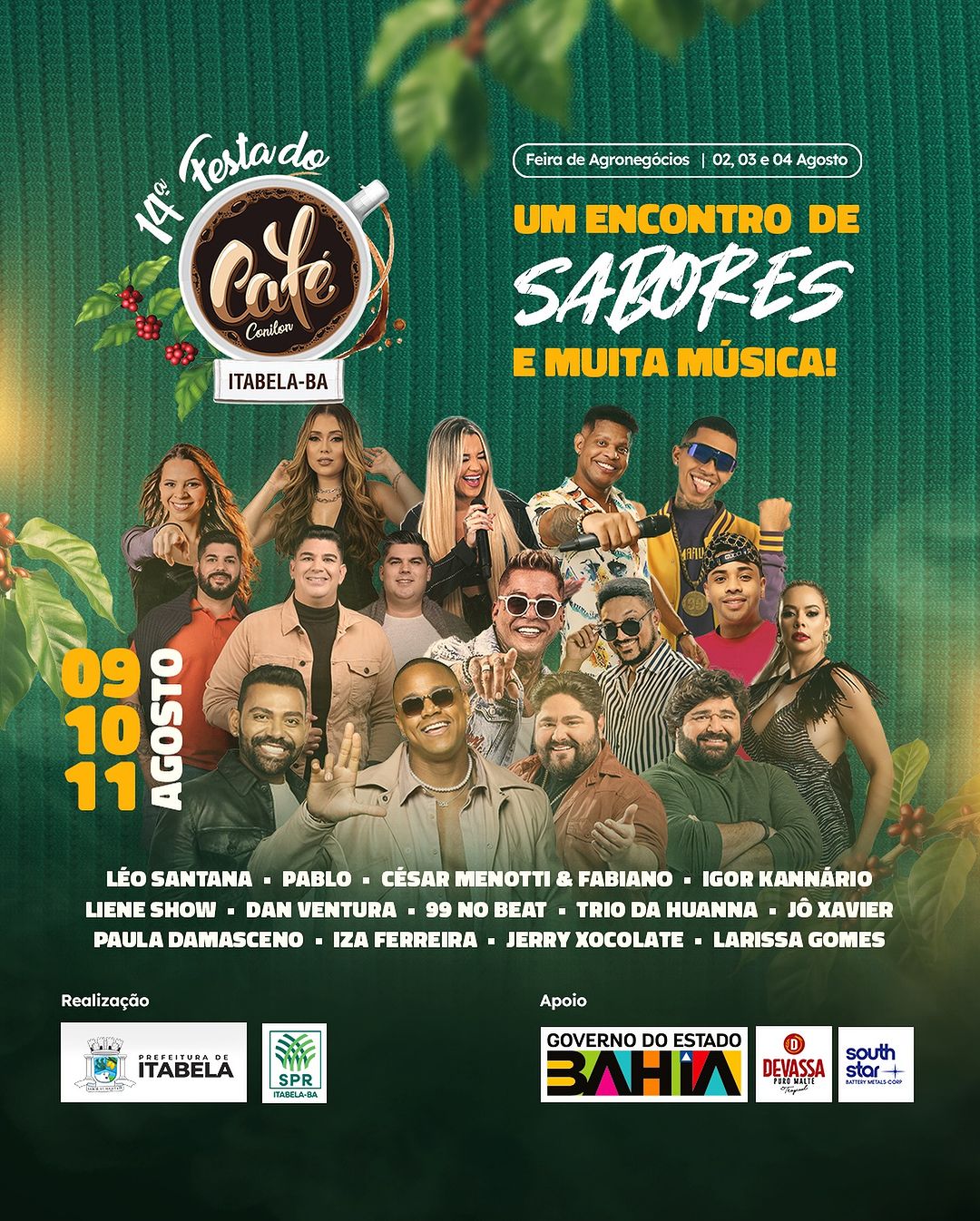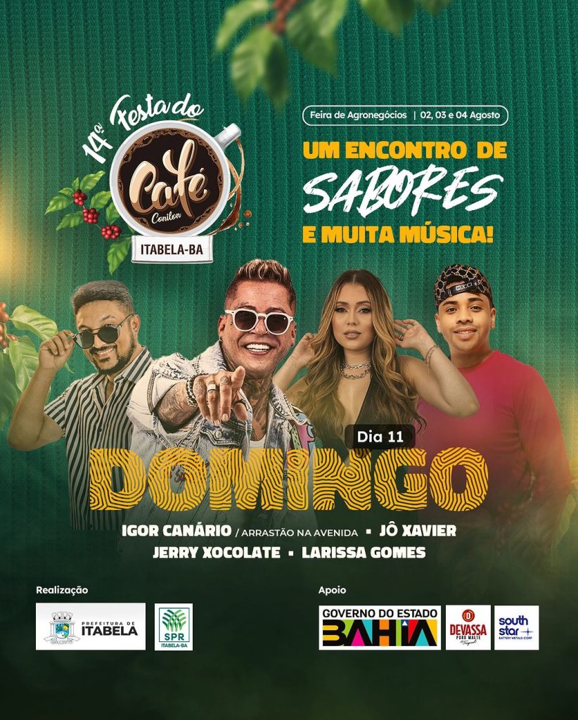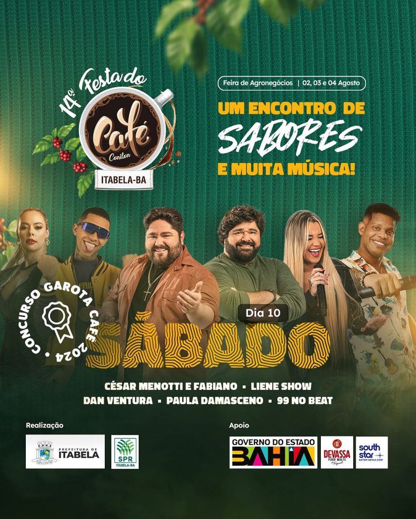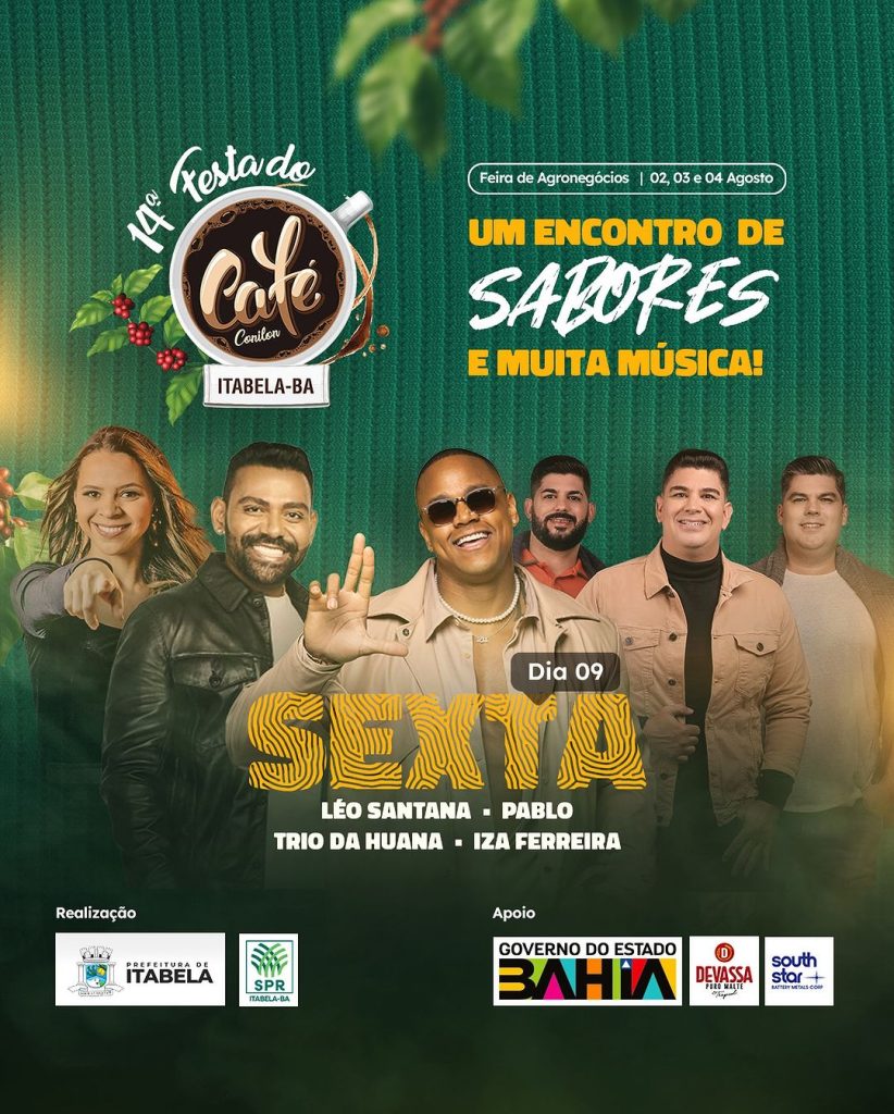 A 14ª Festa do Café Conilon em Itabela está repleta de atrações musicais! Entre os grandes nomes que se apresentarão, temos Pablo, Léo Santana, Cesar Menotti e Fabiano, Liene Show, Dan Ventura e Larissa Gomes.