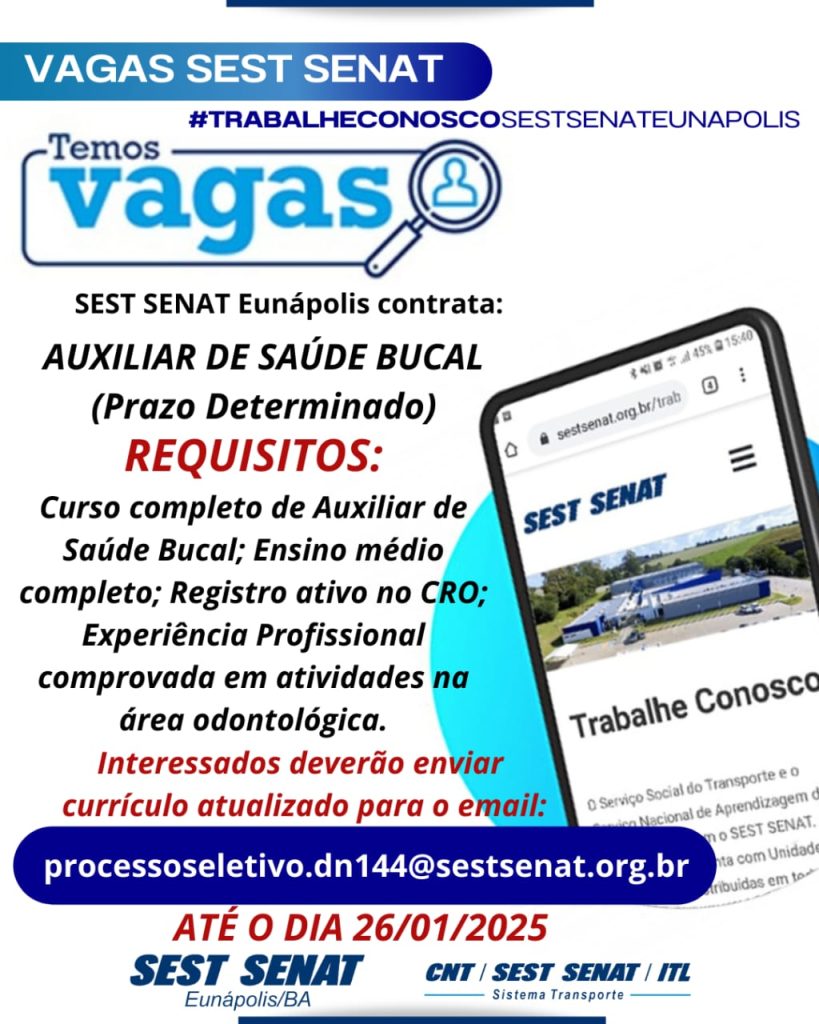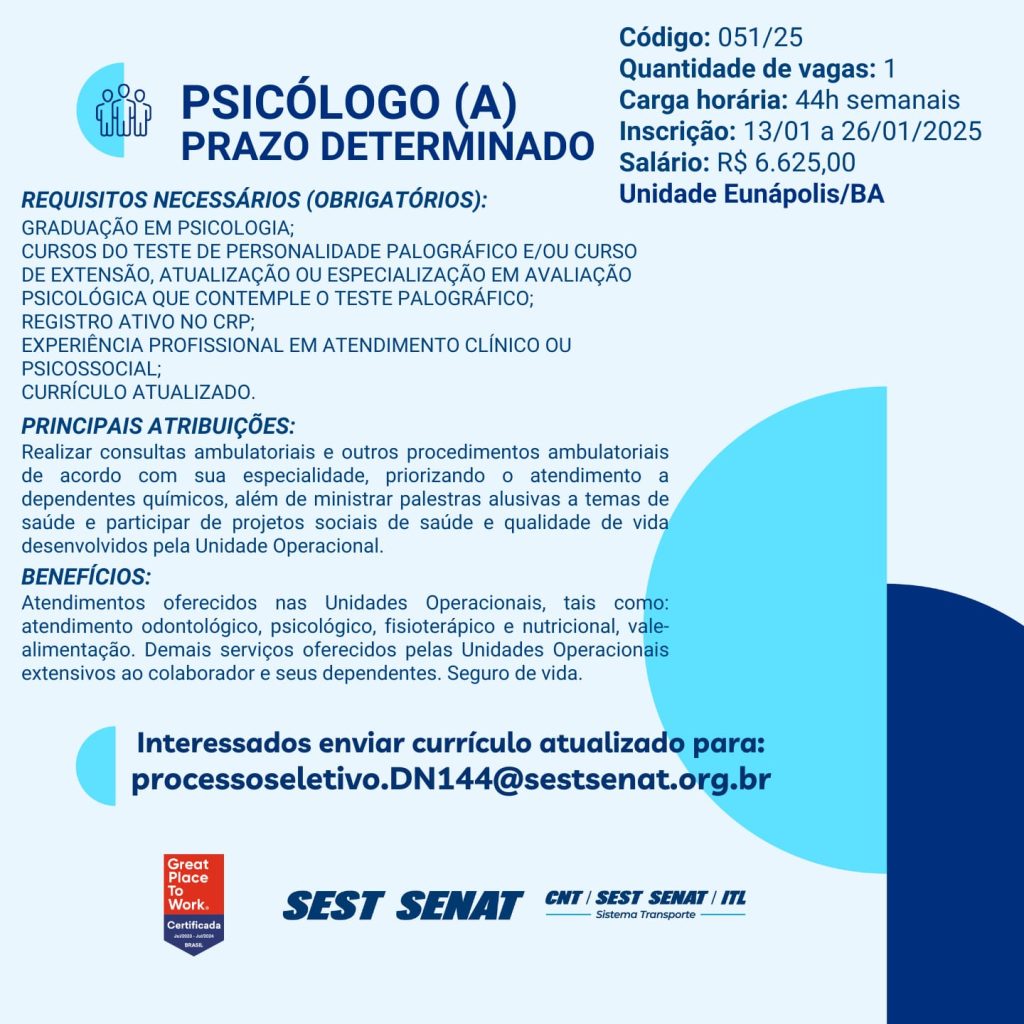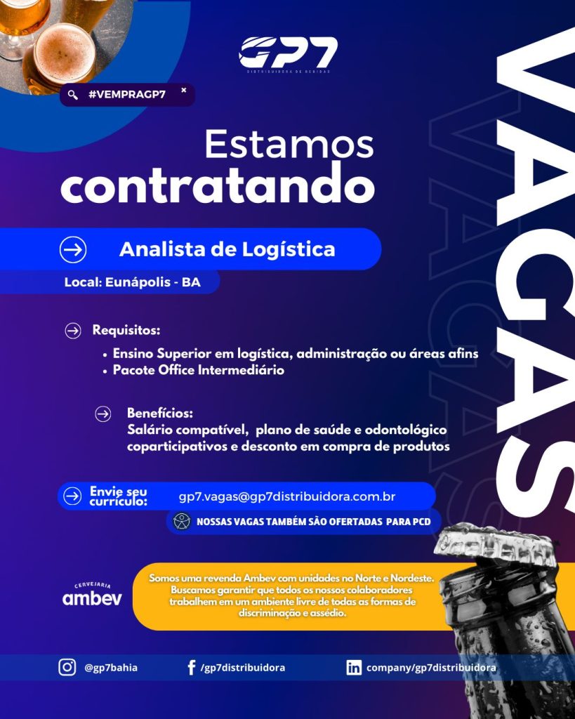 Aviso: As vagas de emprego e estágio divulgadas nesta seção são de responsabilidade exclusiva de seus colaboradores. O site MAIS BAHIA não se responsabiliza pelo conteúdo, veracidade ou quaisquer outras informações relacionadas às oportunidades anunciadas.