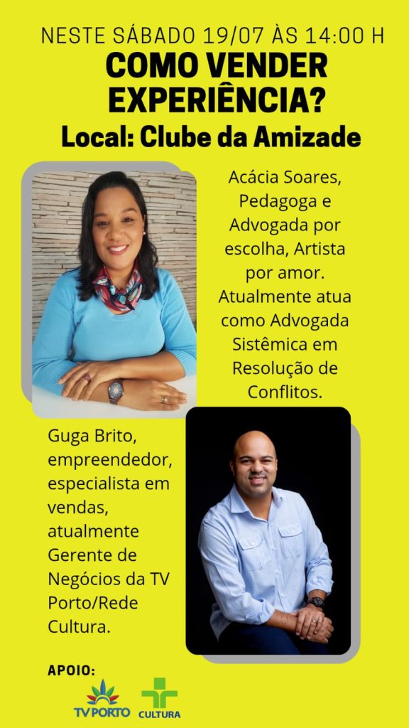 Encerrando a programação com chave de ouro, a Feira oferecerá uma palestra especial de capacitação com o tema “Como Vender Experiência?”, voltada exclusivamente às artesãs participantes. Os facilitadores serão Dra.Acácia Soares, pedagoga e advogada por escolha, artista por amor, que atua como advogada sistêmica e especialista em resolução de conflitos, e Guga Brito, empreendedor e especialista em vendas, atual Gerente de Negócios da TV Porto/Rede Cultura.