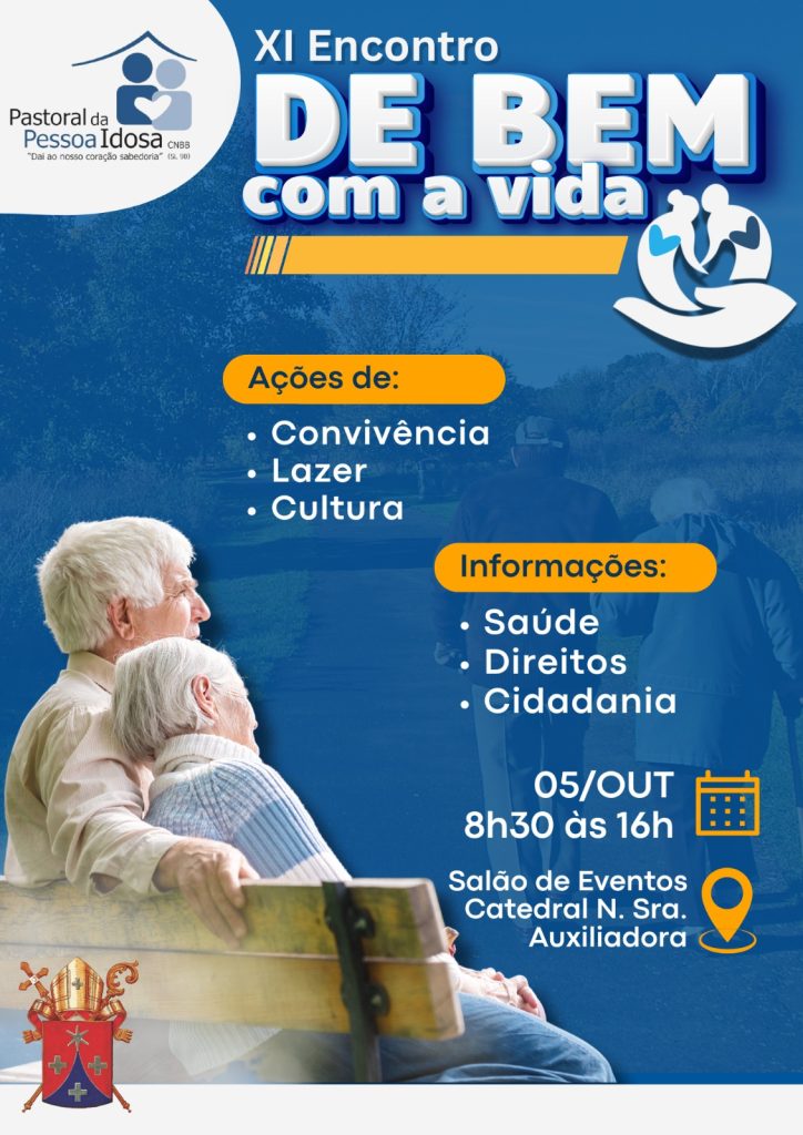 A Pastoral da Pessoa Idosa da Diocese de Eunápolis realizará, no próximo 5 de outubro, a 11ª edição do encontro “De Bem com a Vida”. O evento, que consolida-se como uma das principais iniciativas voltadas à terceira idade na região, ocorrerá no Salão de Eventos da Catedral N. Sra. Auxiliadora, das 8h30 às 16h.