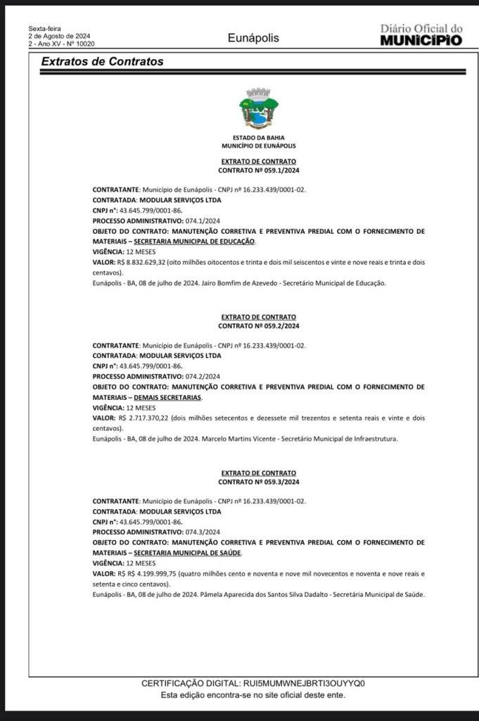O edital ‘extrato de contato número 059.1/059.2 e 059.3 de 2024’, foi publicado no Diário Oficial do Município de sexta-feira, dia 02 de agosto (edição 10020), com data retroativa a 8 de julho e a previsão de pagamento em 12 meses, o que excede a previsão do mandato. A conduta é vedada em lei no período de 8 meses que antecedem as eleições. Ou seja, fevereiro passado.