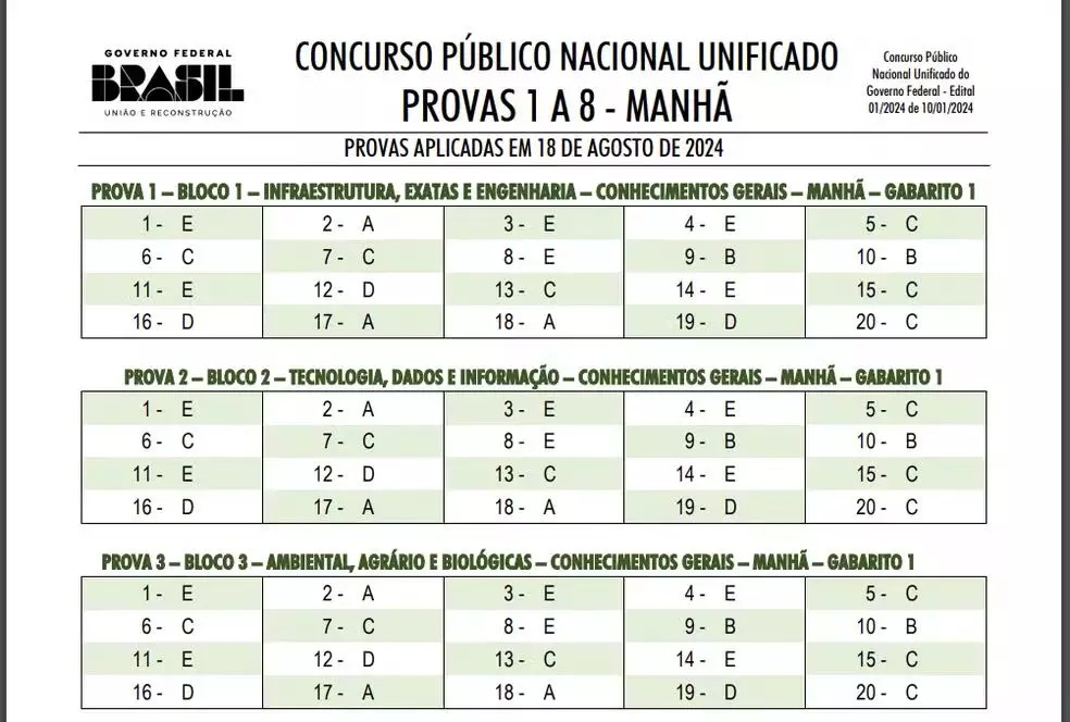 O governo federal divulgou nesta terça-feira (20) os gabaritos oficiais das provas objetivas do CNU (Concurso Nacional Unificado), o chamado “Enem dos concursos”.