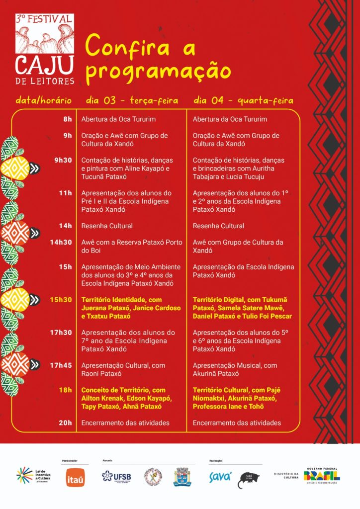 No período da tarde, as atividades estão agendadas para começar às 14 horas. Na terça-feira (3), o Centro Cultural da Reserva Porto do Boi receberá o público com o tradicional Awê Pataxó. Logo em seguida, terão início as mesas de debate. No total, serão quatro mesas que vão discorrer sobre o tema central do Caju de Leitores deste ano que é “Territórios – O Brasil é Terra Indígena”.