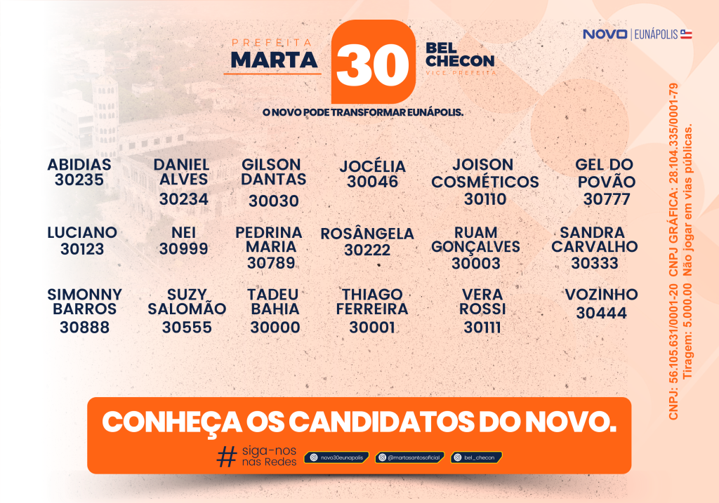 O Novo se apresenta como uma opção renovadora, mostrando que veio para respeitar Eunápolis e os eunapolitanos, oferecendo uma alternativa de gestão pautada na transparência, no compromisso e no respeito à população.