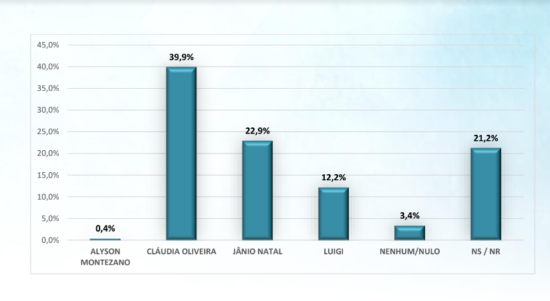 No cenário espontâneo, onde os nomes dos candidatos não são apresentados, Cláudia Oliveira desponta com 39,9% das intenções de voto, seguida por Jânio Natal (PL), que registra 22,9%.