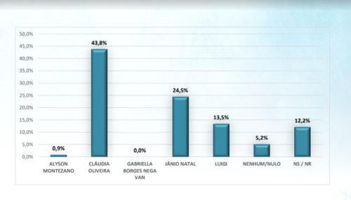 No cenário estimulado, onde os nomes dos candidatos são apresentados aos entrevistados, a vantagem de Cláudia Oliveira cresce para 43,8%, enquanto Jânio Natal alcança 24,5%. LUIGI (PSDB) aparece em terceiro lugar, com 13,5%.