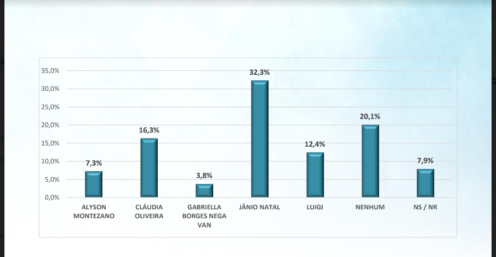 A pesquisa também mediu a rejeição dos candidatos. Quando perguntados em quem não votariam de jeito nenhum, 32,3% dos eleitores mencionaram Jânio Natal, enquanto 16,3% citaram Cláudia Oliveira e 12,4% LUIGI.