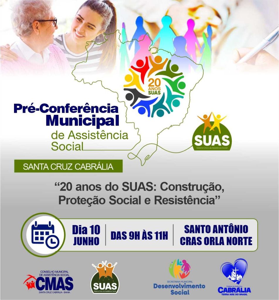 A Secretaria Municipal de Desenvolvimento Social, em parceria com o Conselho Municipal de Assistência Social (CMAS), realiza na próxima terça-feira, 10 de junho, a Pré-Conferência Municipal de Assistência Social na Orla Norte de Santa Cruz Cabrália. O encontro acontecerá no CRAS de Santo Antônio, das 9h às 11h, e terá como tema central: “20 anos do SUAS: Construção, Proteção Social e Resistência”.