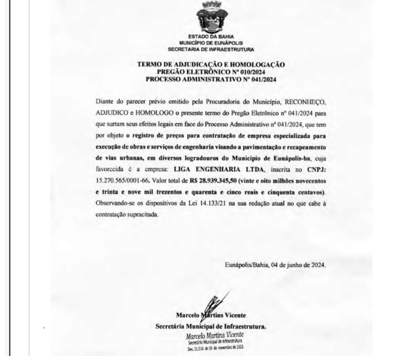 De acordo com a publicação, o documento, assinado pelo Secretário de Infraestrutura Marcelo Martins Vicente, refere-se ao Pregão Eletrônico nº 010/2024 em face ao Processo Administrativo nº 041/2024 e tem como favorecida a empresa Liga Engenharia Ltda.