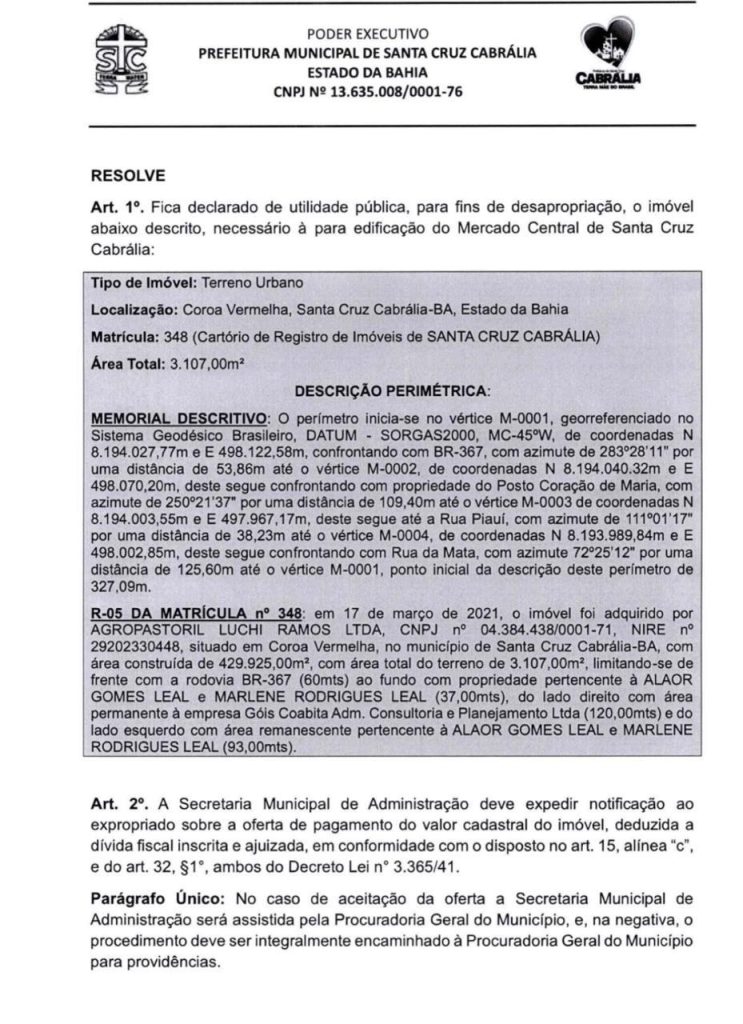 Prefeitura de Santa Cruz Cabrália Desapropria Área Estratégica para Construção de Novo Mercado Municipal