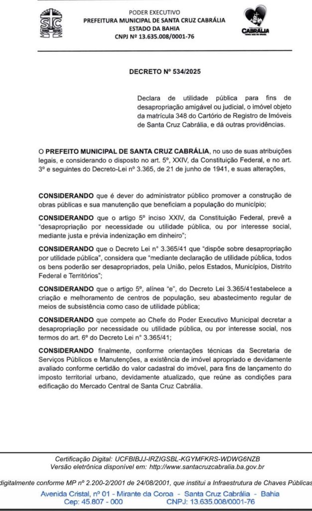 Em um passo decisivo para o futuro de Santa Cruz Cabrália, a Prefeitura anunciou a desapropriação de uma área estratégica de 3.107,00m² para a construção do tão aguardado Mercado Central. Esta iniciativa, formalizada através do Decreto nº 534/2025, é amplamente celebrada como a mais significativa realização da gestão do Prefeito Girlei Lage, prometendo transformar o cotidiano da comunidade e impulsionar o desenvolvimento local.