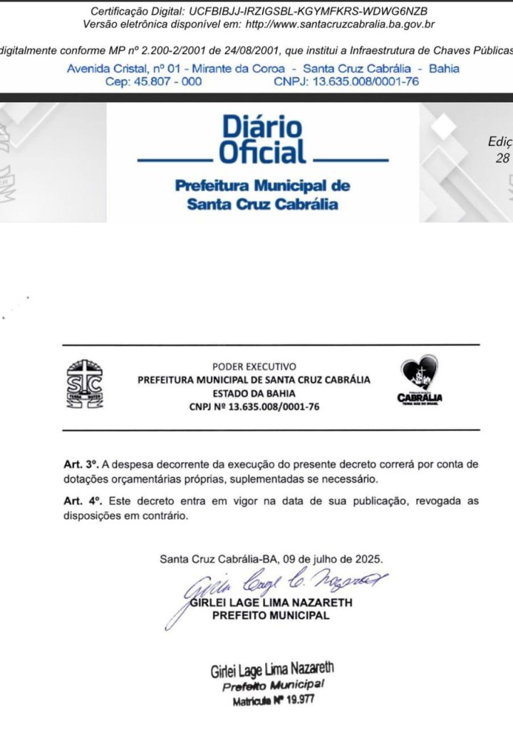 O Prefeito Girlei Lage, ao assinar o decreto, reafirmou seu compromisso com o progresso de Santa Cruz Cabrália. “A construção do Mercado Central não é apenas uma obra; é a materialização de um sonho antigo da nossa população e um pilar fundamental para o futuro da nossa economia”, declarou o Prefeito. “Esta é, sem dúvida, uma das mais importantes realizações da nossa gestão, pensada para trazer benefícios diretos e duradouros para cada morador de Santa Cruz Cabrália.”