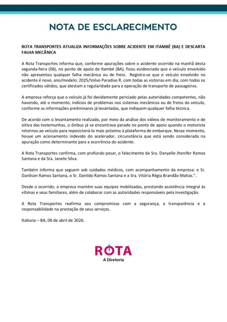 A Rota Transportes emitiu uma nota de esclarecimento na manhã desta segunda-feira (06) sobre o grave acidente ocorrido no ponto de apoio de Itambé, no sudoeste baiano. Segundo a empresa, as investigações preliminares descartam a existência de qualquer falha mecânica ou nos sistemas de freios do veículo envolvido na tragédia.