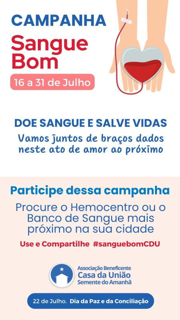 Neste mês tão especial, em que celebramos o Dia 22 de Julho, oficializado em diversas cidades e Estados do Brasil como o Dia da Paz e da Conciliação, a Casa da União convida a todos os membros e colaboradores da CDU e da Beneficência do Centro bem como todos os cidadãos para uma ação beneficente coletiva de doação de sangue.