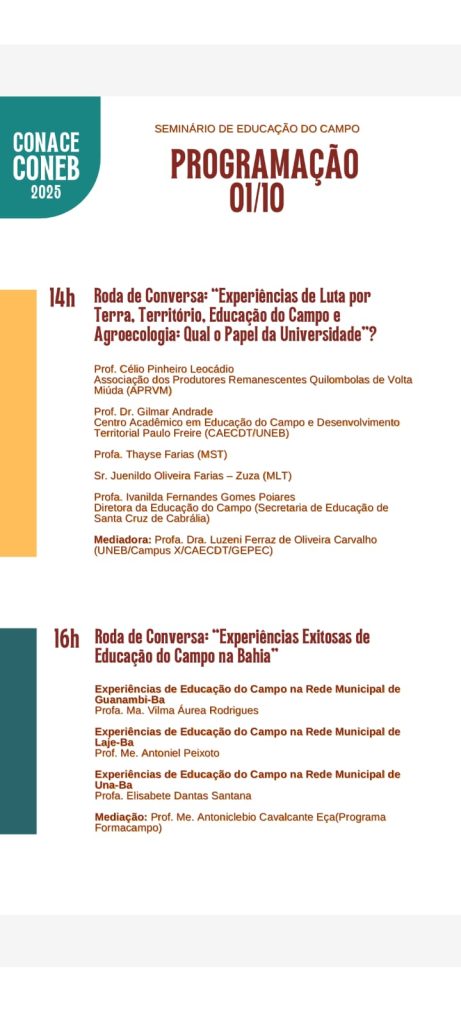 Na sequência, às 16h, a Roda de Conversa: “Experiências Exitosas de Educação do Campo na Bahia” volta o olhar para a gestão e a execução local de políticas educacionais.