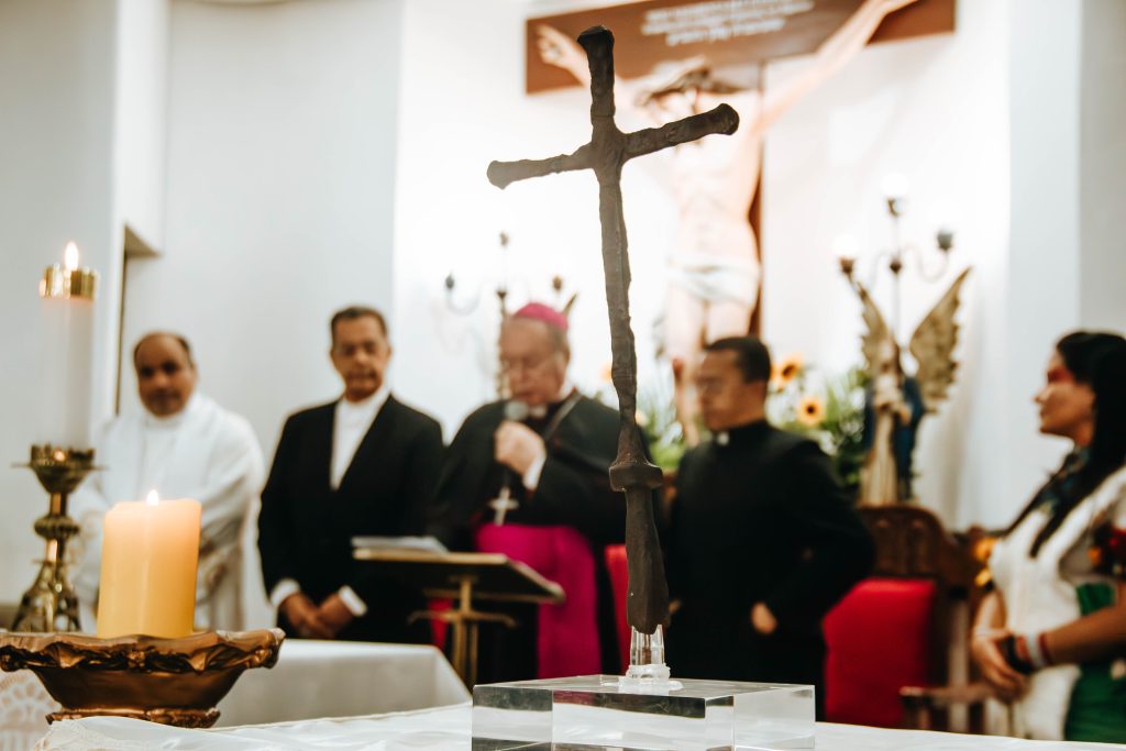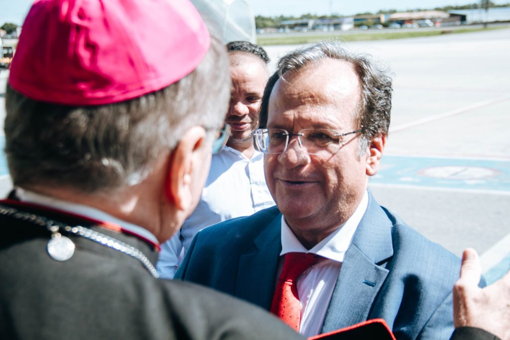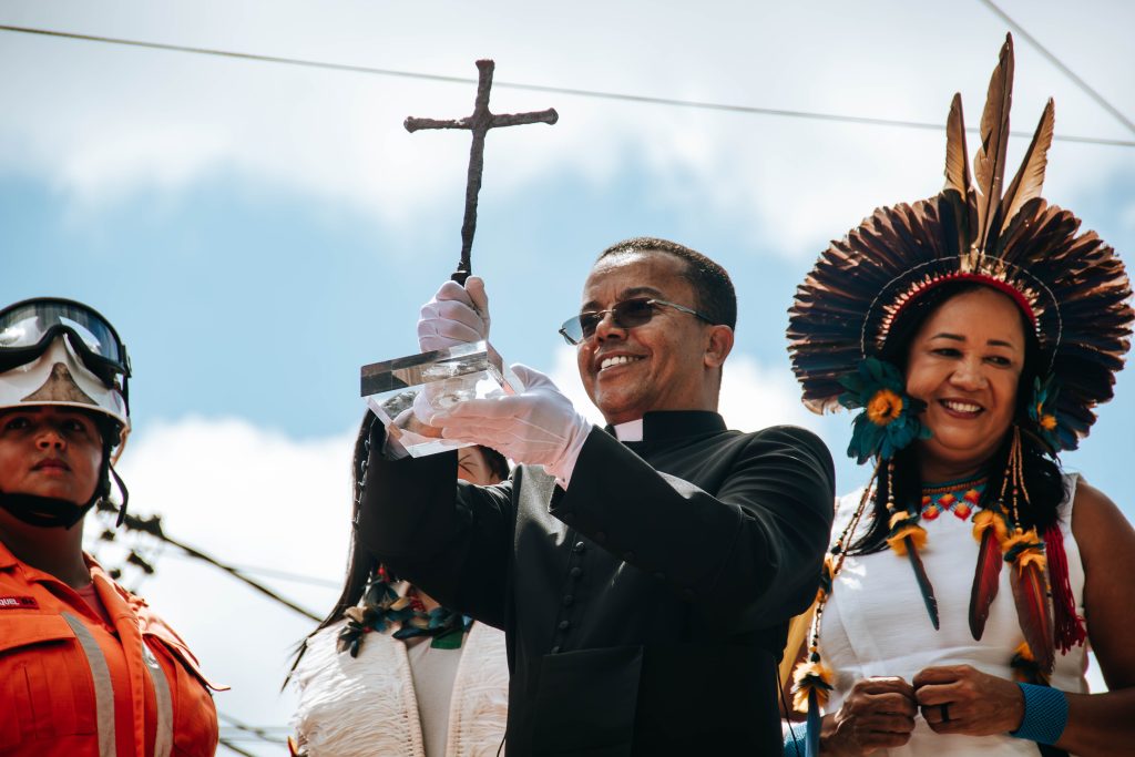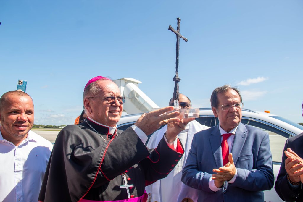 Na manhã deste terceiro dia das comemorações pelos 525 anos da Primeira Missa no Brasil, uma cerimônia solene marcou a recepção da relíquia histórica no Aeroporto Internacional de Porto Seguro. A cruz, trazida de Salvador em um voo especial, foi recebida com grande comoção por autoridades religiosas, civis e uma multidão de fiéis.