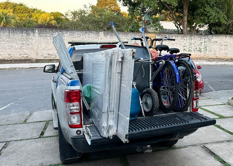 Materiais para construção, bicicletas, ventilador, panela de pressão, carnes congeladas e alimentos comprados com os cheques falsos, foram apreendidos nos bairros Alicrim I e Sapucaieira em Eunápolis.