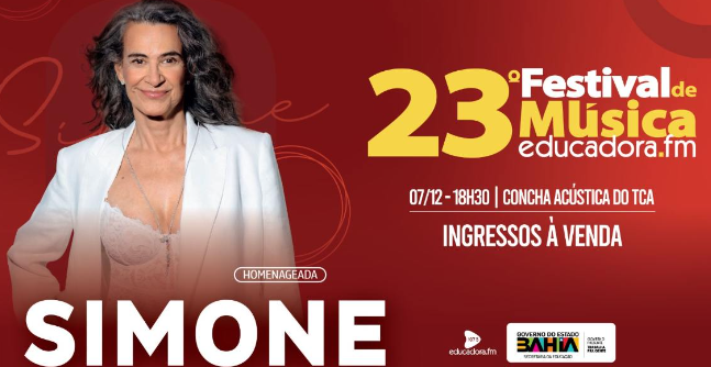 Depois de celebrar cinco décadas de carreira com a turnê “Tô Voltando”, sucesso absoluto que revisitou a discografia da cantora em mais de 40 shows pelo Brasil, Simone apresenta ao público de Salvador a turnê que leva o seu nome no título. O show acontece dia 07 de dezembro na Concha Acústica, às 19h, com ingressos à venda no https://bileto.sympla.com.br/event/111615/d/342544/s/2324256. Reconhecida como uma das vozes mais importantes da Música Popular Brasileira, o show marca a homenagem que ela recebe no 23º Festival de Música da Rádio Educadora FM.